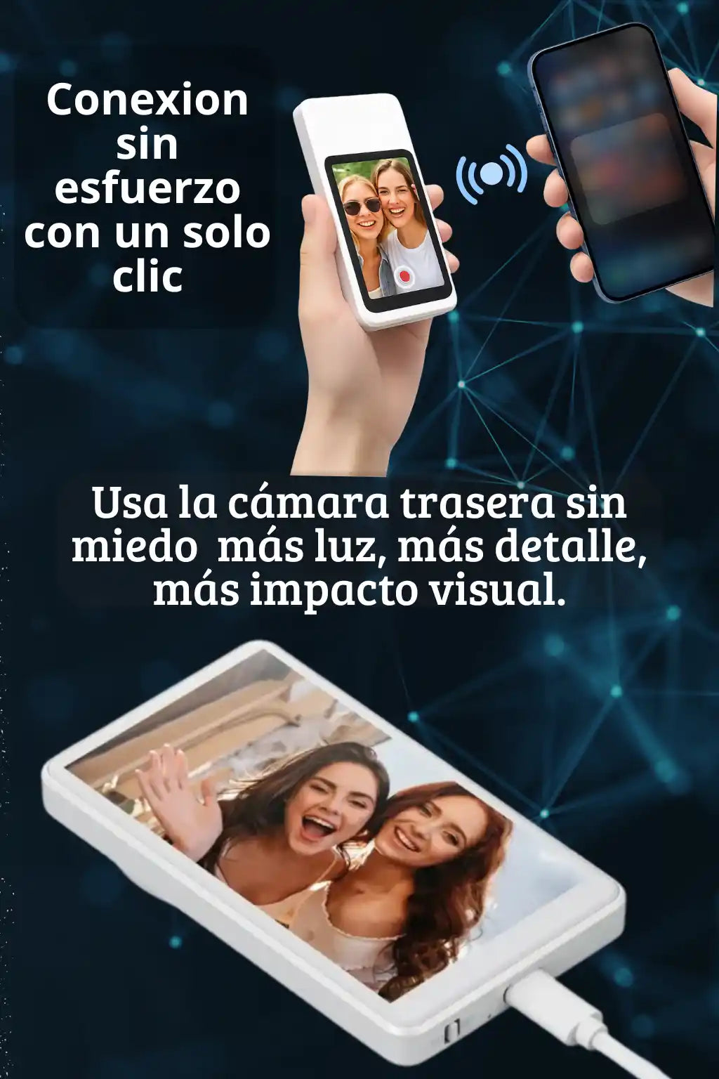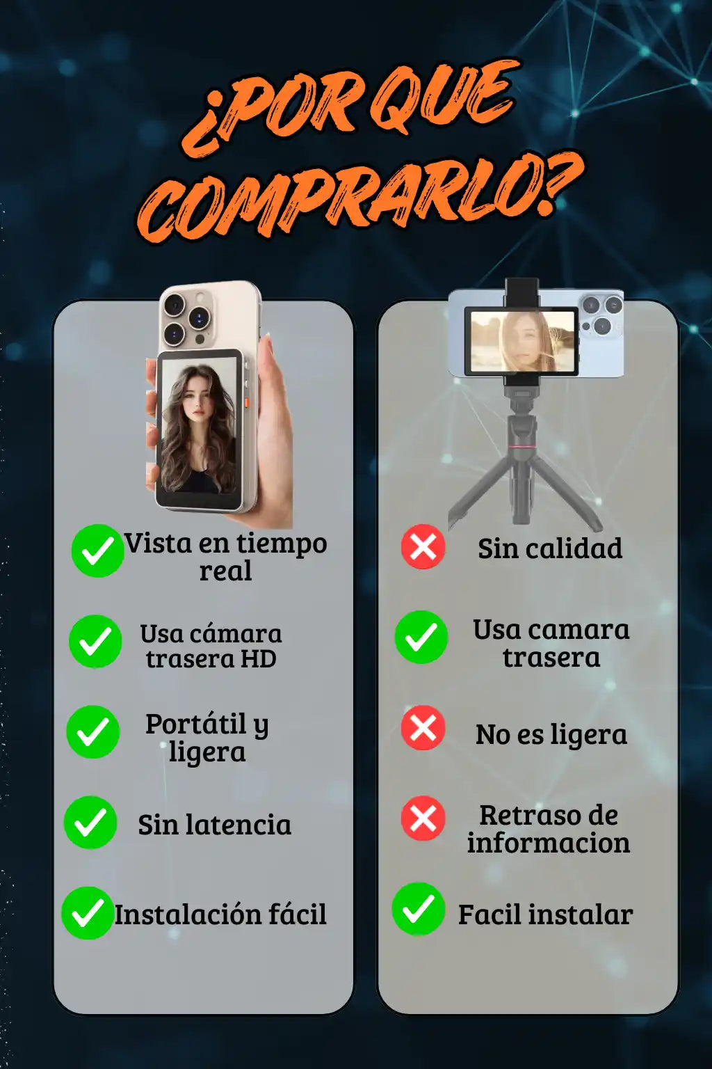 Tu contenido se verá con mayor calidad, porque usarás la cámara trasera. Y tú te verás más seguro porque siempre sabrás cómo apareces en pantalla.