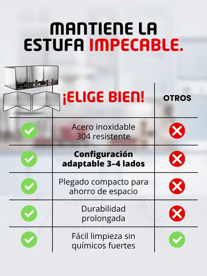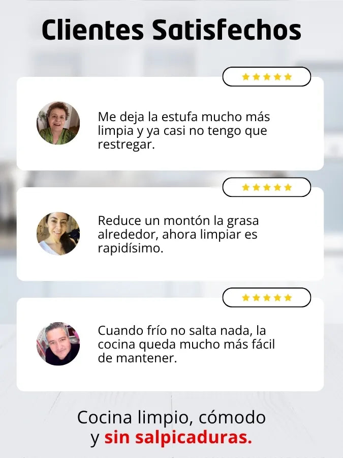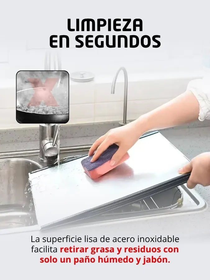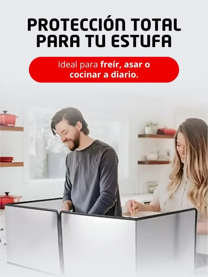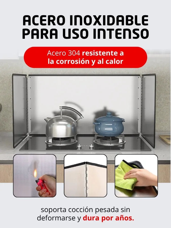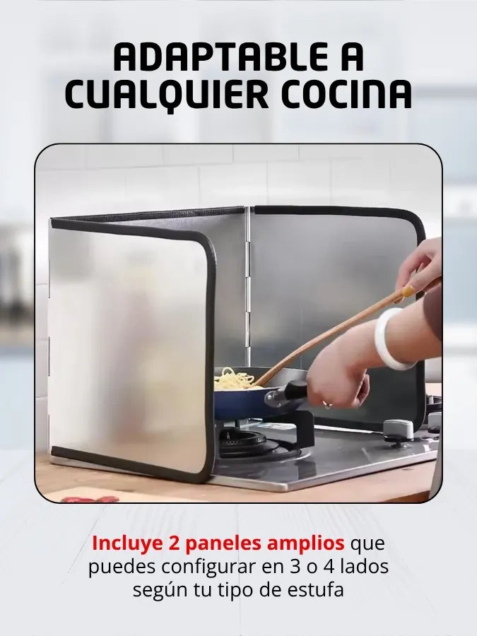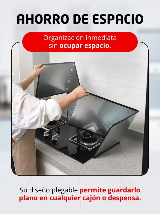 No requiere instalación. Solo despliega los paneles y ubícalo alrededor de la sartén o área de cocción.