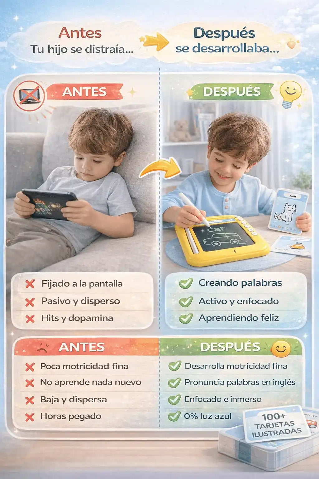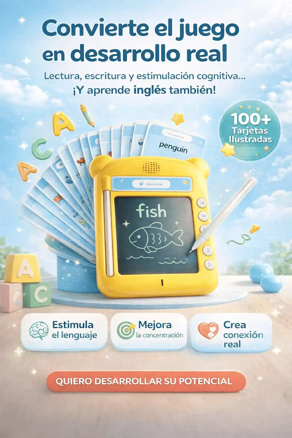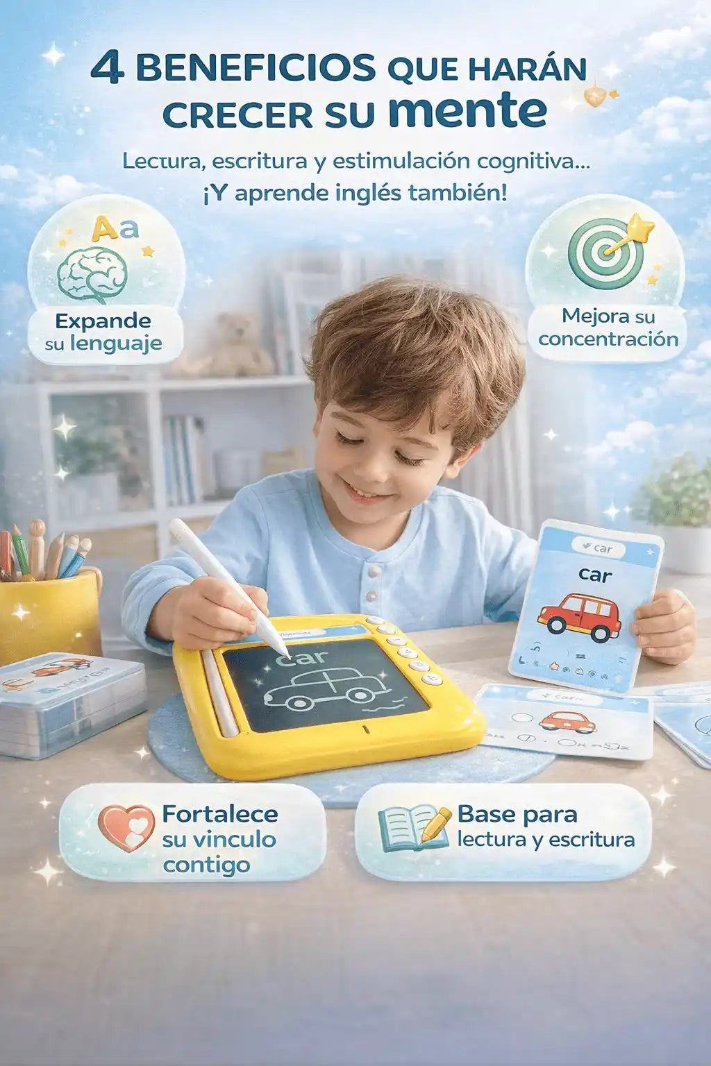 Está diseñado con principios de asociación visual y repetición activa, base del aprendizaje temprano. Los resultados se notan en pronunciación y reconocimiento.